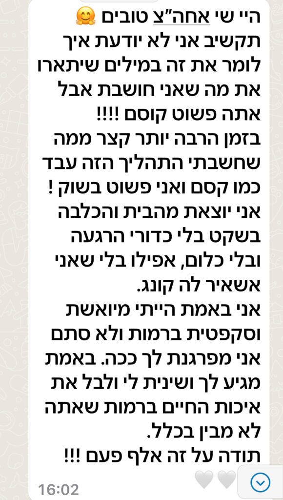 אני באמת הייתי מיואשת וסקפטית ברמות ולא סתם אני מפרגנת לך ככה. באמת שינית לי ולבל את איכות החיים ברמות שאתה לא מבין בכלל.